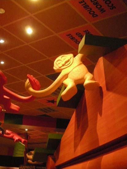 At the end of the queue line you have to climb two sets of stairs as you walk through the building. You pick up a set of 3-D glasses before you make the climb. Finally you go down a set of stairs and a CM assigns you to a line. There are lines numbered 1-8. The ride vehicles for this ride have a front and back. Two seats in the front and two seats in the back. The people in the front seat actually sit ‘back-to-back’ with the people in the back seat. Something that surprised me is that this isn’t a continuous loading ride like Buzz Lightyear. The eight cars are moved to a ‘testing’ area for you to practice shooting your ‘cannon’. These cannons have a string on them and you have to let the string come back all the way before you can shoot again. It happens quickly.As you go through the ride there are different point-value targets. There are separate screens for the front and back passengers each themed with characters or scenes either from or inspired by the Pixar film Toy Story. You can see your total points in your car like Buzz.