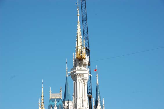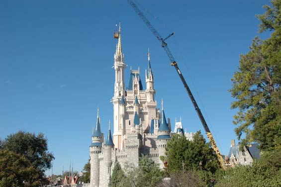 As we walked down Main Street you notice that the crane is up to take down the lights off Cinderella Castle. They have just started. The walkway on the right that takes you behind the castle is closed while the crane is there.