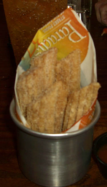 Just a word about some of the appetizers…..if you look around prior to ordering, these apps look like huge portions. They are served in these aluminum cones and it appears that they are piled high. Upon receiving ours, we realized that the bottom of the cone is filled with a waxed parchment paper with food resting on top. The portions are adequate, but the serving dish is deceiving. This could affect your ordering, but now you know.