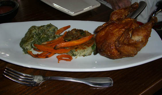 The “baseball sized” hen was accompanied by more of the potato pancakes and roasted carrots. We also received a serving of creamed spinach with out ordering it.