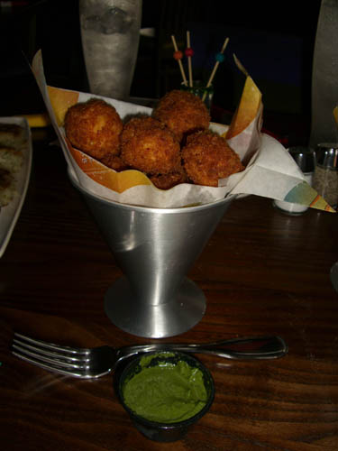 The Mac and Cheese bites were small balls of deep fried mac and cheese. While they were ok, they didn’t have a whole lot of flavor. The good news in all of this is that they came with a delicious jalapeno and cilantro dipping sauce. We used that dipping sauce with the pancakes and the corn nuggets. It was quite flavorful with just a slight spicy kick. Ask for extra.
