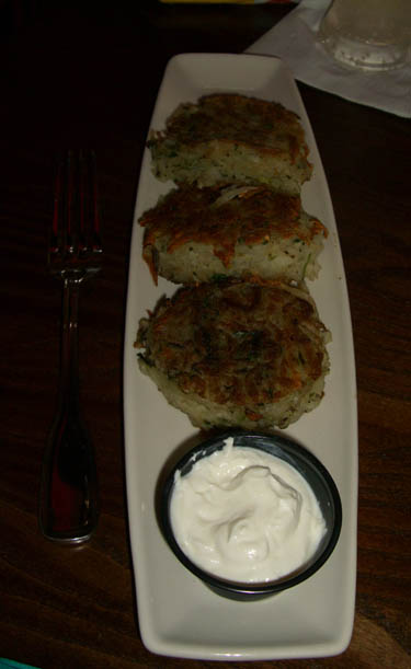 The corn dogs and potato pancakes were pretty standard. The pancakes could have been a bit crispier, but had good flavor. The dogs came with a honey mustard dipping sauce and the pancakes came with sour cream.