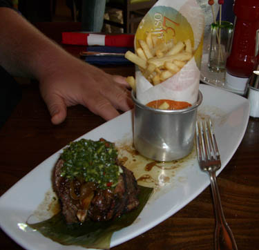 The steak was a thin cut wrapped around a wooden skewer and grilled. It was served with caramelized onions, chimichurri sauce and fries. The beef had a good flavor, but the whole thing was a bit greasy. It seems that the kitchen is aware of this as the entire entrée was served on an absorbent piece of paper. This was deemed “good and tasty, but not worth $20 bucks”.