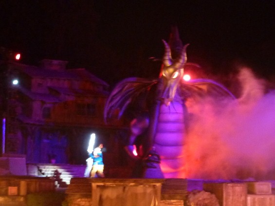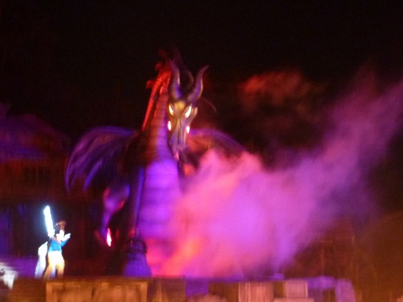 Then came time for Maleficent to cast her spell. We really weren’t sure what was going to happen. It almost looked like the usual transition, but the water screens stayed up much longer than expected. Lots of animation of the dragon transformation was projected onto the screens, it seemed to go on so long that I thought that the dragon was broken or not being used – after all, we hadn’t really seen it since March or so – when the dragon was taken out.