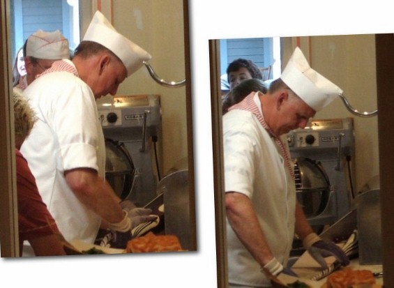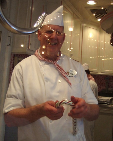 Suffice it to say, a day of filming never goes as planned – you learned that in my last blog on the parade taping. I arrived for the Candy Cane line at the directed time and saw that they were still in the heat of taping a segment on making waffle cones with his older son, Hunter, in the Gibson Girl Ice Cream Parlour. Undaunted, I planted myself in line with a delightful mother-daughter duo from Central California that we met when we first saw the sign – we all had the same goal at the same time! They had also heard the glories of the Candy Canes and wanted some for themselves, as well. Certainly being on the edge of an actual television shoot is an interesting experience, and doing it with fellow chatty souls is also, so we weren’t bored in line. I think that is probably one of the things that I find most interesting about waiting in lines at Disney – it brings all sorts of people together and for a brief 40-60 minutes, you get to bond and share your likes and dislikes, give tips, gossip, and just really enjoy touching the lives of people that you will never see again.