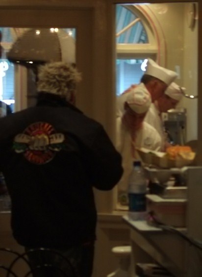 I really think it’s just to keep guests from leaping the counter and drooling in the chocolate – a la Willy Wonka…. Yummmmm…………. Before I digress further, it would behoove me to describe the kitchen itself. It’s a very small white room with counters and stainless steel and marble tables. In the center is a large copper pot and a machine for keeping large quantities of chocolate melted, to the perfect candy-making temperature. The two confectioners had begun to pour ingredients into the large copper kettle to begin the process. From my own experience, the copper pot is one of the most critical parts of the candy making process due to its ability to quickly transfer consistent heat at the high temperatures needed to turn sugar into confections. This process can take a little while, especially in the quantities they need to produce for selling to guests. As they started this, the film crews were setting up cameras outside the window, and discussing how they would use the handheld cameras in the room over Guy’s shoulder.