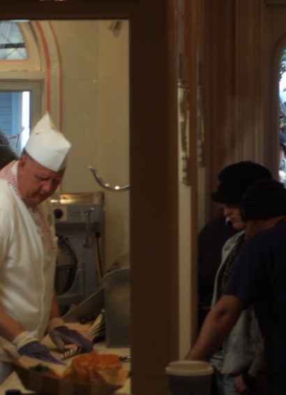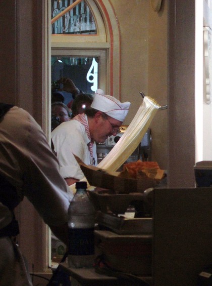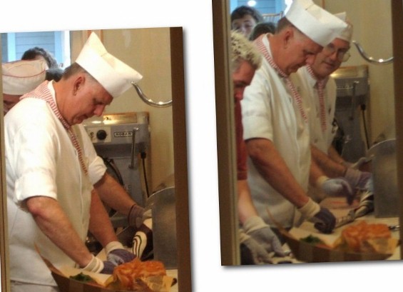 By this point, we had gathered quite the little line of about 12 people – and we were all bonding quite nicely. He began chatting with us from behind the cash register, as he ate his lunch. It was about 1pm, after all… I think he assumed we were all hanging out watching the taping and were fans – because you should have seen the expression on his face when I explained to them that we weren’t really there for him – we were there for the Candy Canes! His puzzled look quickly turned to one of awe and wonder. You could see in his face that he was now understanding that the power of the Candy Canes was a force now to be explored and that soon he would be participating in more than just a cooking adventure. He and I then talked briefly about his patron-inspired sushi at Tex Wasabi’s, his restaurant in Sacramento, California – the stuff you have to ask the waiter specially for, like the Dirty Magazine Roll. (Remember – I wasn’t corresponding for y’all back then, so this was all normal one on one banter.) When we were done, they opened the door to the kitchen and off he went.