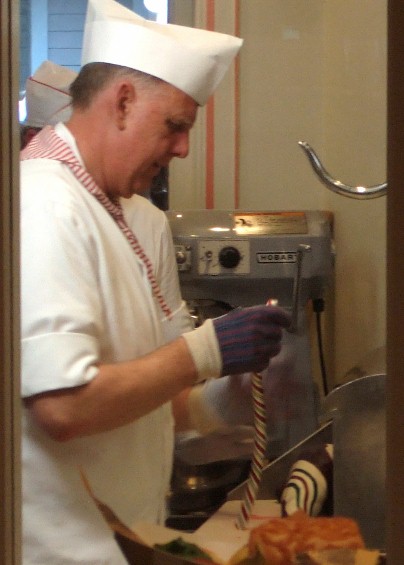 They entice you. All shiny, with their glistening, swirling, red and white stripes. You can almost taste them with your eyes. This is one of the great, but not well known (until now) holiday traditions at Disneyland. The making of the Candy Canes at the Candy Palace, on Main Street in Disneyland, is truly one of the old-fashioned pleasures. If you are lucky enough to be there on certain weekdays in December, you will catch a glimpse of these beauties – and maybe even a celebrity to boot! Such was the case last December, when I got a chance to watch Guy Fieri pulling Candy Canes as part of his new holiday special “Guy’s Disney Holiday”, which airs on the Food Network this weekend, at 9pm EST/8pm CST on 12/5 and again at 12 am on 12/6. with a repeat again on the weekend of 12/11 and 12/12.