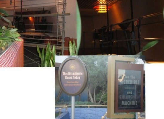 It was exciting to watching the “Honey” signs come down and the building get a new overhaul. I’m sure there will be a few changes to the show – nothing is done exactly the same, especially since the special effects for the original movie had to give way when they rebuilt the theater for “Honey“. Who knows what cool things they will do to enhance this original version? Tony took some photos of them fixing up the preshow screens and the queue area, in order to get ready for the limited run.