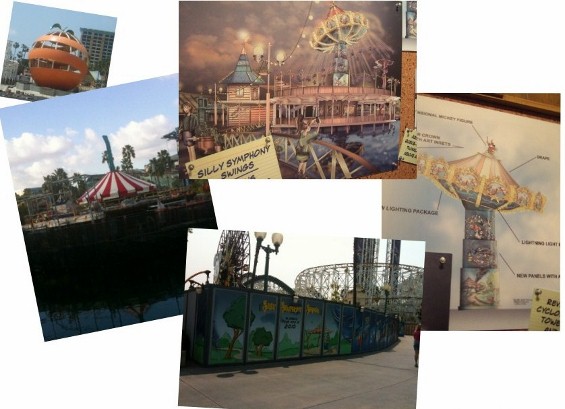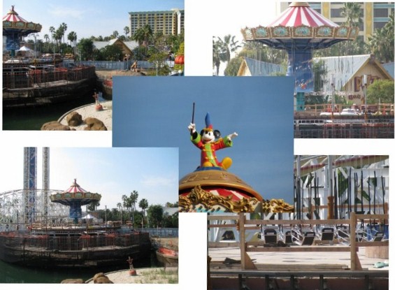 April 28, 2010 brings the opening of the Silly Symphony Swings. For those familiar with the older version of California Adventure, this new attraction is a re-theming of the Orange Stinger. The original ride was a twist on traditional carnival swings that rise and tilt inside a giant “partially peeled” orange. It’s not the first time this ride has been altered. The original “bee seats” were removed early on and replaced with traditional swing seats (that’s where the “Stinger” came from).