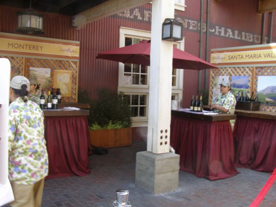 Accoutrements in hand, we crossed the rope into the wine walk. The walk consisted of 4 stations or trade-show style kiosks, representing the 4 most famous wine regions of California. Each kiosk had 3 wines for us to choose from – representing some of the well known vineyards in that area (or some with extra money for marketing and sponsorship lying around – I couldn’t decide…). The backdrops for each kiosk had details of that region, for those who wished to educate themselves further. We were in a bit of a hurry, so we kind of by-passed that feature.