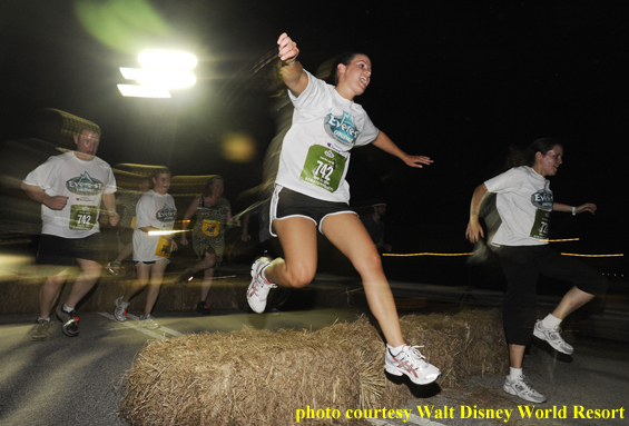 Racers made their way over the bridge to Discovery Island and headed towards Africa. They went backstage on an out and back section of the course following the Wildlife Express train tracks towards Rafiki’s Planet Watch. It was here runners met the second obstacle, 10 tires lined up to step through, just before the second mile marker. The racers re-entered the park, headed towards Asia, and past Expedition Everest. Next, they crossed the bridge to DinoLand U.S.A., made a right to Discovery Island, and back to the park entrance. Once outside the park, runners were required to hurdle the third obstacle, a series of six hay bales.
