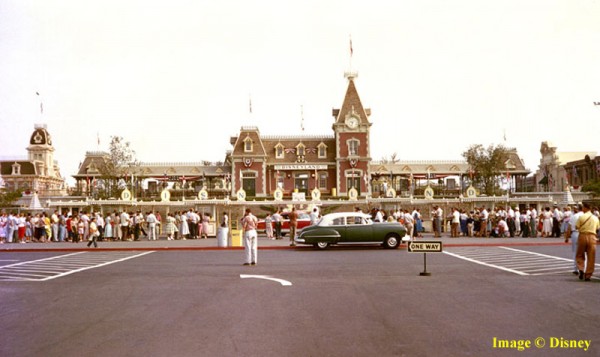 Image: This is a rare color image of opening day taken outside the Main Entrance of Disneyland on July 17, 1955.