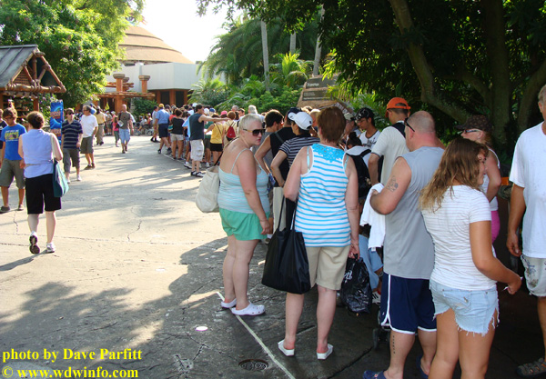 Spirit Rally ended, and we turned to go to Dragon Challenge. Wham! Stuck! We were against the flow of traffic, and could not walk. We waited, and eventually, forced our way through the crowd like salmon swimming upstream. Guests begrudgingly parted until we passed under the Dragon Challenge archway. Wait time was 10 minutes for the attraction.