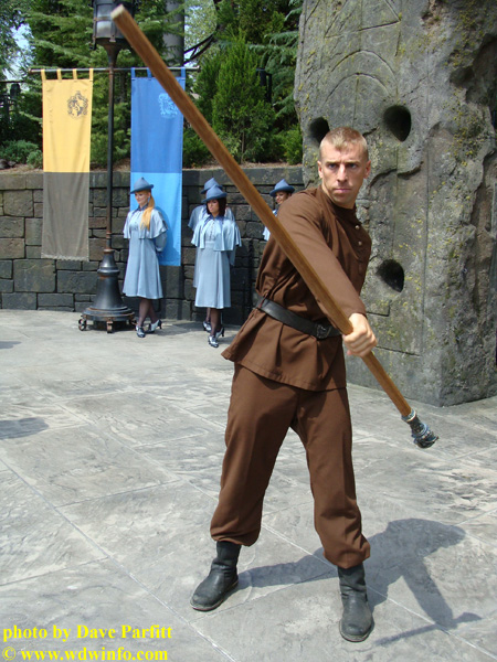 After we exited Flight of the Hippogriff, we noticed the participants of the Triwizard Spirit Rally entering the stage area. So, again, we decided to watch. Three “students” for Durmstrang displayed their combat skills.