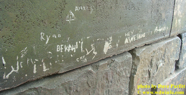 Temporary chains were set up for crowd control, but not wide enough to accommodate a wheelchair. We could move them for the chair, but some forethought by Universal would have been better. Many people must get bored waiting in line because in a number of places people had scratched and carved on the walls. Not a particularly magical sight…