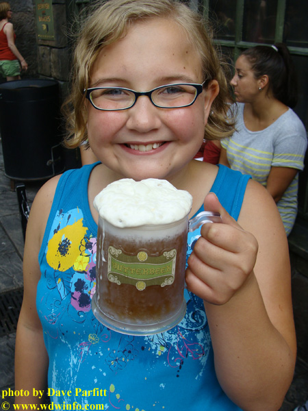Maggie bought us butterbeer while we waited. We purchased two glasses – one in a plastic souvenir mug. As with the pumpkin juice, butterbeer was a very sweet, filling drink. It was quite tasty, similar to a melted Werther’s butterscotch candy with a thick, rich head on it, but our family could have shared one glass and we would have been fine.