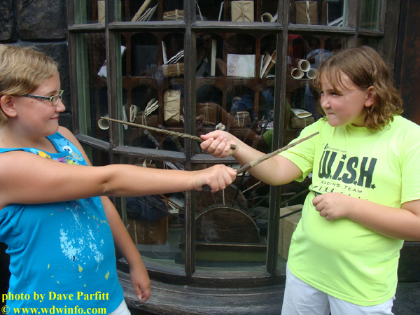 We had not yet entered Ollivander’s Wand Shop – something the kids anticipated all summer. In fact, they had done extra chores and saved money to buy their wands. When we arrived, the line for Ollivander’s was nearly 2 hours. Sheesh, we could watch an entire Harry Potter film during that time. However, we asked the girls what they wanted to do – they said they wanted to wait. We took a deep breath, entered the line, and waited, and waited, and waited…