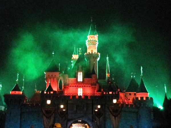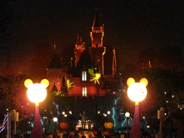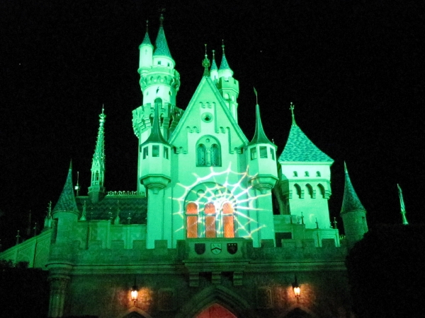 Sleeping Beauty Castle was appropriately lit up with changing Halloween colors and fog from the top of the turrets. Shadows of spiders and ghosts would occasionally crawl up the walls.
