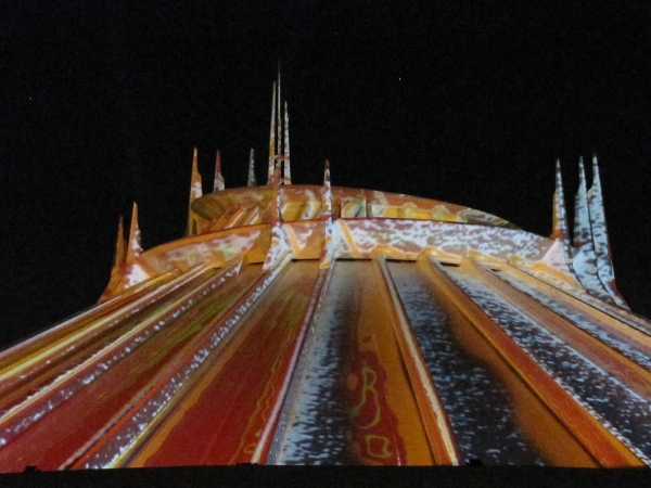 Over in Tomorrowland, Space Mountain has been transformed to the Ghost Galaxy attraction. The Space Mountain ride is enhanced with some special effects inside the mountain, but what was also fascinating was what was going on outside the Mountain. Special moving patterns were being projected onto the Mountain surface and are accompanied by a haunting and trance-like sound as the patterns change and swirl. Occasionally a special sequence would be projected which appeared to further distort the Mountain. It was hypnotic to watch.