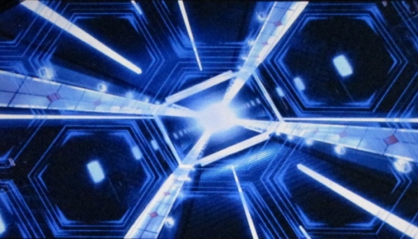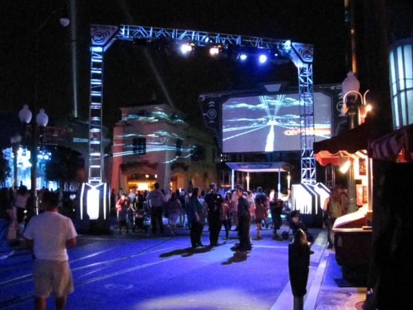 At the end of the street an enormous video screen displayed computerized images from the TRON environment.  Periodically a bright orange Light Cycle would race across the screen.  Graphic images would dance and change and make kaleidoscope-like patterns.  It was easy to become mesmerized with all the visuals.