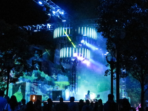 As I entered ElecTRONica, I was immediately overwhelmed by the lights and sounds of the entrance area.  Large chrome stage trusses rose from each side of the main street and crossed overhead.  Moving lighting instruments displayed colored patterns on the street.  Video images of the TRON environment were projected on the buildings on each side of the street.  Sounds accompanied the projections.  All around was the sound of modern dance music.  To say the least, this was immersive.