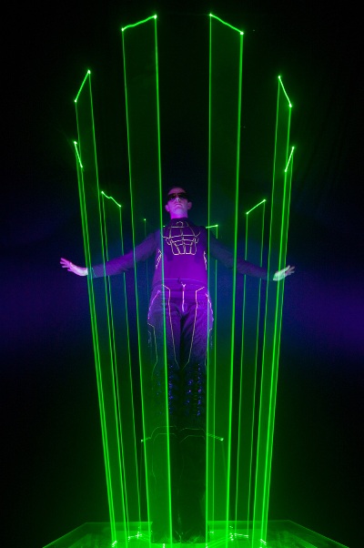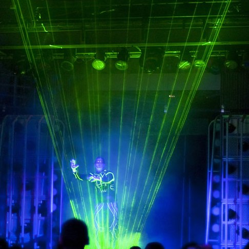 One of the highlights of ElecTRONica is a specialty performance by Laserman.  Dressed as one of the TRON characters, Laserman dances and plays with actual laser beams projected from the platform he stands on.  He intercepts the beams with his hands and diverts them to form patterns and effects in time to his music.  The lasers appear to respond to his gestures and swirl around him as he moves.  This is a wonderful performance and the audience responded loudly.  Laserman was my favorite part of ElecTRONica.