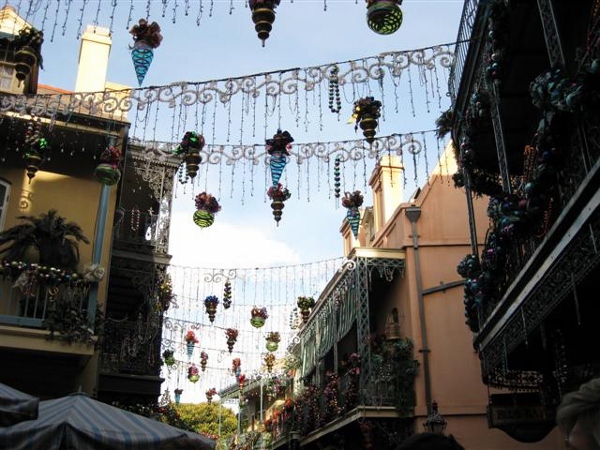 As you wind your way back through the park, you find unique holiday touches all over the place. New Orleans Square has its own flavor, with garlands of baubles high above Royal Street.
