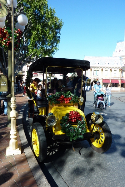When you first emerge from under the Railroad Station and step onto Main Street, in Disneyland Park, you can’t help but realize that you have been dropped headfirst into the holiday season. To say it “smacks you in the face” is a bit crass, but, well…. you get my point. I can’t help but smile at the décor. EVERYTHING is decorated! We entered via the left tunnel and were greeted with the sight of the Main Street Vehicles, bedecked with pines and ribbons. The sound of jingle bells rang out from the harnesses of the horse drawn vehicles, while honking horns alerted you to the cheery sight of holiday enhanced cars, such as the Horseless Carriage, waiting to escort you to the hub and castle!