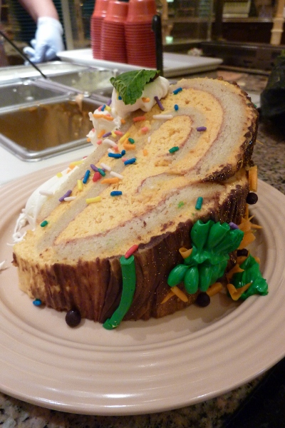 When the Christmas Fantasy Parade is over, it’s a great time to grab a snack – and the holidays host some pretty special ones. While you can find all sorts of treats that are decorated for the season, none is as traditional and cherished as having a slice of Yule Log cake, found at the Plaza Inn. This year, there are two varieties. The pumpkin one, that I had, will be available until after Thanksgiving. Then, the more traditional version, made with chocolate and chestnut, will be found until Christmas. They are light and tasty – and enough for 2 or 3 people to share!!!!