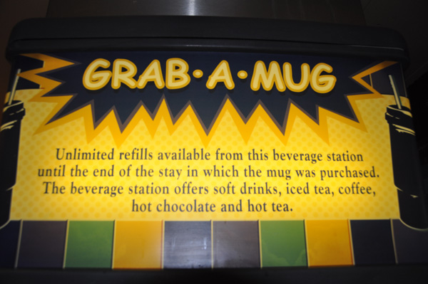 The cost of the mug is $13.99 plus 91 cents tax, bringing the total to $14.90. The mugs do have the text, Refills available at no additional charge at Resort Beverage Island located in the resort that this mug was purchased through the end of your resort stay. For those that debate the rules, here is what Disney has to say about using the mugs.