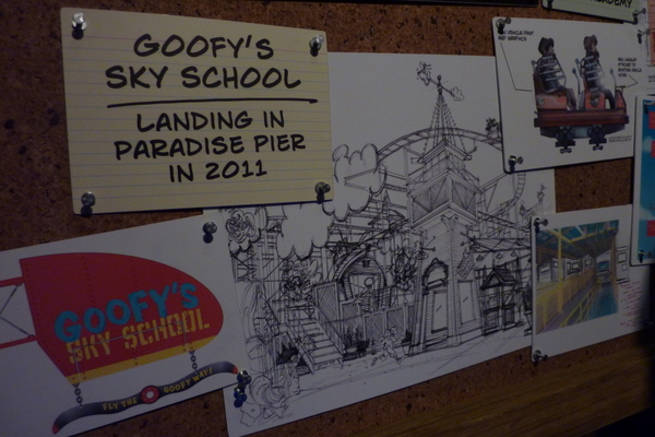 Goofy’s Sky School is the retheming of the old Mullholland Madness roller coaster.  As you can see by the display below, the existing ride is being “slightly” modified so that Goofy can teach you how to” fly” over and around his little corner of Paradise Pier.  The new theming seems to make this coaster a cross between the theming of the “recently-retired” Barnstormer at Walt Disney World’s Magic Kingdom and the track design of Primeval Whirl at Animal Kingdom.  It certainly seems to feature several similar elements, including new “airplane” theming of the cars, a barn, and (rumor has it) chickens!