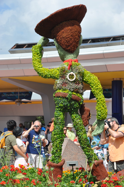 This year there are new topiary characters from the Disney-Pixar film, Toy Story 3. I love the attention to detail that Disney has when they create something. Notice the pull string on the back of Woody.
