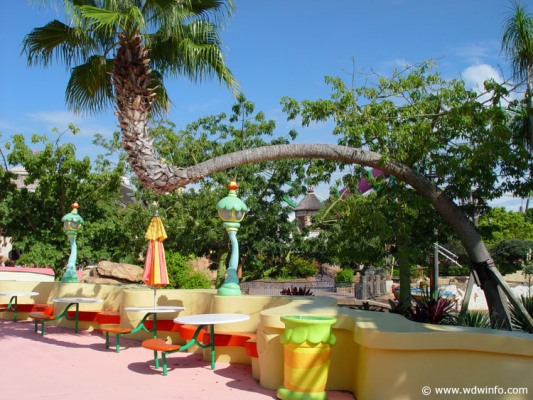Palm trees that survived hurricane Andrew were used inside Seuss Landing because they were bent and curved from the strong winds providing the land with a more whimsical effect.