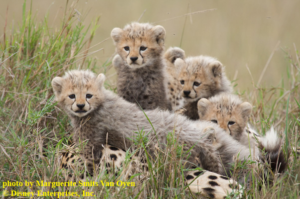 There are two animal “families” prominently featured in the film. First is a mother cheetah named Sita and her cubs. Scholey mentioned when they arrived in the Masai Mara National Reserve on the border of Kenya and Tanzania, they stumbled upon Sita who had just given birth to 5 cubs. Scholey knew instantly the cheetah family would play a prominent role in the film.