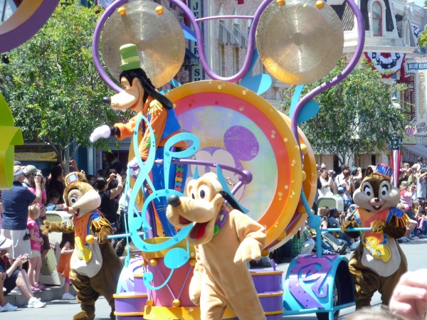 Following Mickey’s lead, Goofy comes along with his own small float that is really a large drum. Chip, Dale, and Pluto escort him along, as he takes time to join in the rhythms.