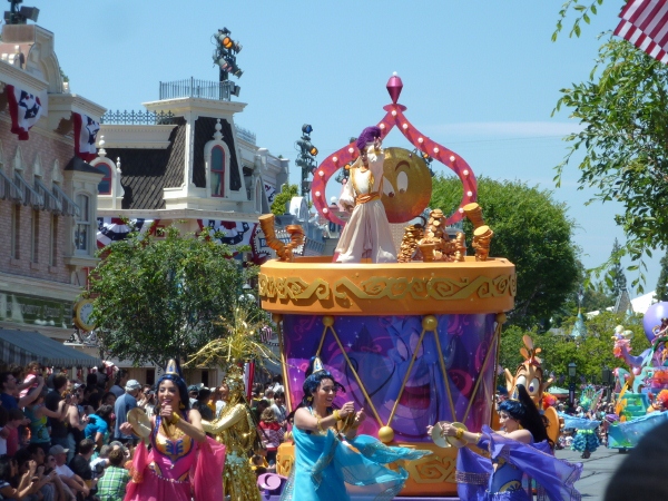 The marching tune fades away as the next float approaches. Exotic Arabian dancing girls, including a golden one, even wearing brass lep on her hands (those are Thai folk dance finger nail extensions – I had a heck of a time Googling them…). Each of the other dancers has cymbals on her wrists, to give an interesting twist to the percussion sounds. Aladdin rides atop a large drum, with Genie in the shape of a gong as his backdrop. The music changes to his movie’s parade song, “Prince Ali“.