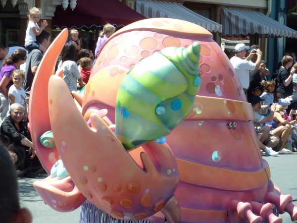 Colorful scallop shells and jellyfish glide down the route to the calypso music of “Kiss the Girl“. Sebastian and his gallant aquatic steeds lead the procession, as Ariel rides above, “swimming” as the “hot crustacean band” plays!