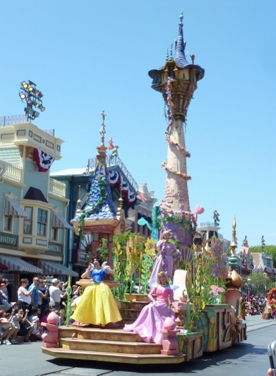 More ladies in voluminous skirts now come into view – attendants to the Princesses‘ Float. With Cinderella‘s staircase and clocktower (which shows that it is almost midnight) in front and Belle’s town fountain in the back of the float, Rapunzel’s garlanded Tangled tower rises up the middle. Along with Snow White, Aurora, Belle, and Cinderella, Rapunzel royally greets the crowd to the tune of “I See the Light“. I was thrilled to see this change from the traditional princess float. It creatively mixed elements from several of the movies, while giving the new princess her place in Disney’s royal family.