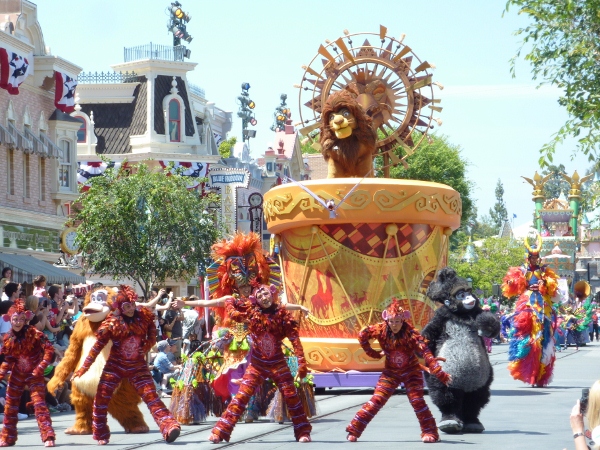 The music transitions to “The Circle of Life“, welcoming another drum carrying Simba, star of The Lion King. Turk, King Louie, and a passel of monkeys take the lead with an amazingly costumed African dancer, whose creatively interpreted dress is on wheels! It’s never a Disney parade without stiltwalkers and the African drummers in the rear are not a disappointment!