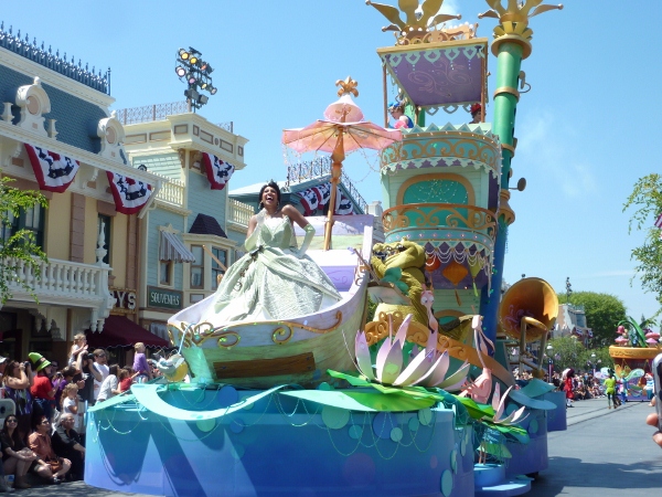 Looking up, we see Ray leading Princess Tiana’s parasoled skiff through the bayou lilypads. Louis is not far behind, playing “Gonna Take You There” on his trumpet on the bow of a gilded riverboat – complete with trombones on the sides and a paddlewheel on the back!