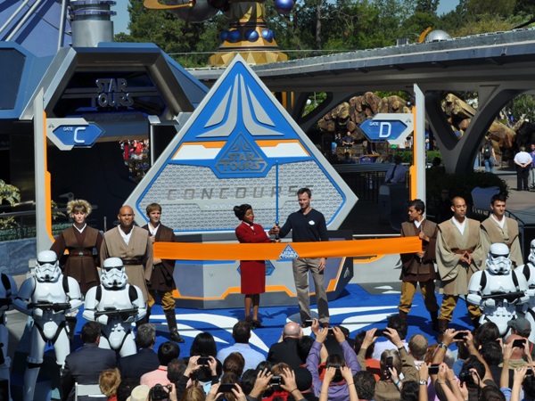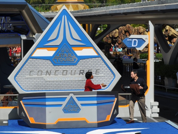 Star Tours: The Adventures Continue officially opened Friday at Disneyland. For a look inside the ride, check out Dave Parfitt’s recent blog about the Disney Hollywood Studios version….they are exactly the same. I was lucky enough to be able to attend the opening ceremonies, and after the spectacle of the ceremonies for The Little Mermaid: Ariel’s Undersea Adventure a day earlier, my expectations were high. Read on for some pictures and details from the event.