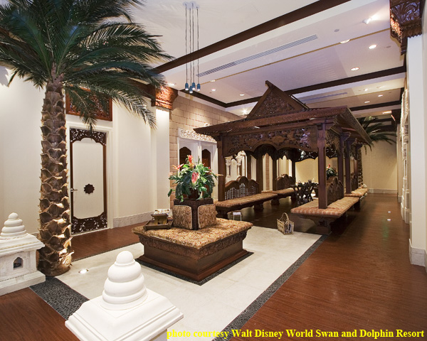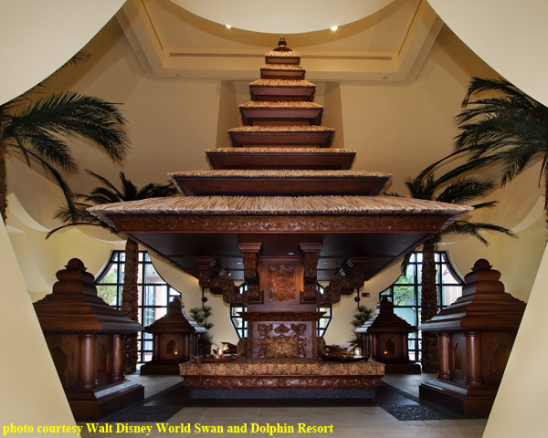 The Mandara Spa is an Asian-inspired retreat using carved woods, art, and architecture to immerse guests in the look and feel of the Indonesian island of Bali.  The spa transports its clients to a place far away from Walt Disney World.  Within the spa are both tea and meditation gardens overlooking the causeway between the Swan and Dolphin hotels and Crescent Lake.  The tea garden contains a hand-carved replica of a traditional Balinese bale (pictured above), a thatched-roof open pavilion used for relaxation.  The meditation garden features a 25-ft Meru sculpture centerpiece (similar to a pagoda), surrounded by stone lanterns and thematic rock gardens. The meditation garden at the Mandara spa is the only spa in the country to feature an authentic Meru temple.