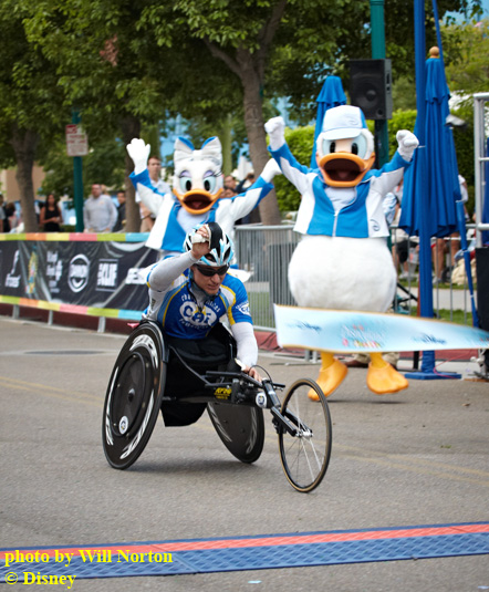 First across the finish line was wheelchair competitor Marc Aten of Moorpark, CA, who crossed the Disneyland Half Marathon finish line with a winning time of 1:02:21 for the wheelchair division on Sept. 4, 2011.