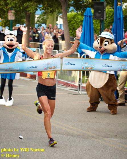 A mere 10 minutes behind the top men’s finisher, Rachel Booth (30) of Mandeville, LA was the first woman (and 9th overall) across the line in 1:18:01 or 5:57/mile pace. She successfully defended her 2010 victory, and is training for a spot on the US Olympic Marathon team. Regarding her finish Booth said, “after last year I had to come back and see what I can do. There is nothing better than running through the theme parks, Castle and all the other fun things.”