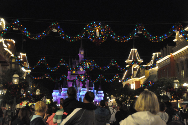 If you are coming to see the castle lights and you are looking for a good spot to view them, think about standing in the Hub up near the castle. Please be aware that if you get up close to the castle, when the show starts people that had been sitting will stand up so you may want to be further back. I heard lots of nasty comments from people over this.