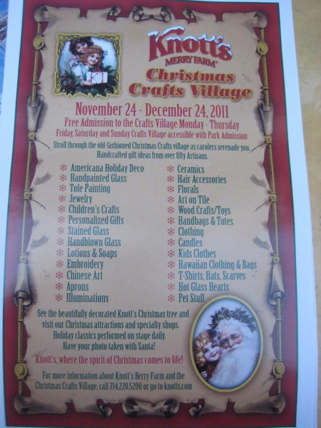 This year, my daughter, Kelly, and I decided to visit the Knott’s Christmas Crafts Fair, and so I searched the internet for information about it. I was really disappointed that for 2011, Knott’s does not have information about the Crafts Fair on its website. By searching various websites, I was able to put some information together, but not enough.