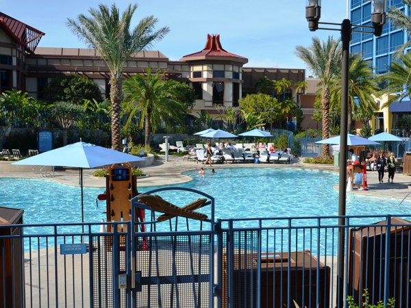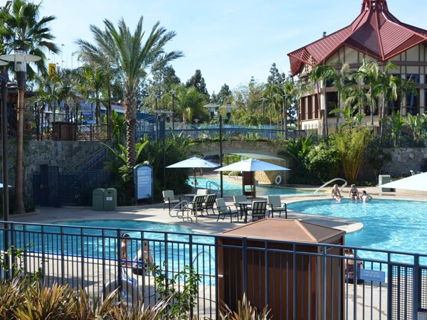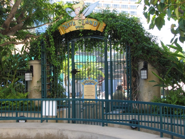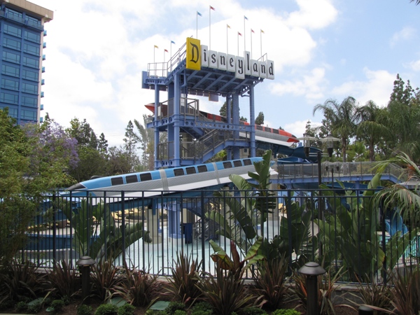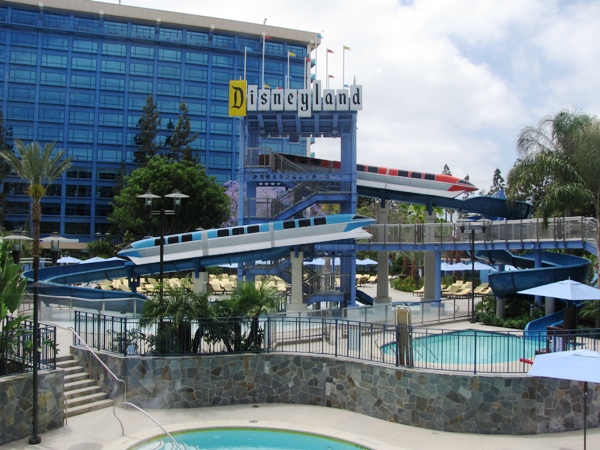 The Disneyland Hotel’s entire swimming pool complex is completely new, with a new theme and encompasses a much bigger area. The old Neverland pool is gone. Now we have the huge E-Ticket pool, the D-Ticket pool and the wonderful Monorail waterslides! The pools are much more open and greatly enhance the area between the three Towers. A pedestrian bridge crosses over the pool area and connects the new Tangaroa Terrace restaurant to the Goofy’s Kitchen area. You can get some great views of the pool and the whole Hotel complex from the bridge.