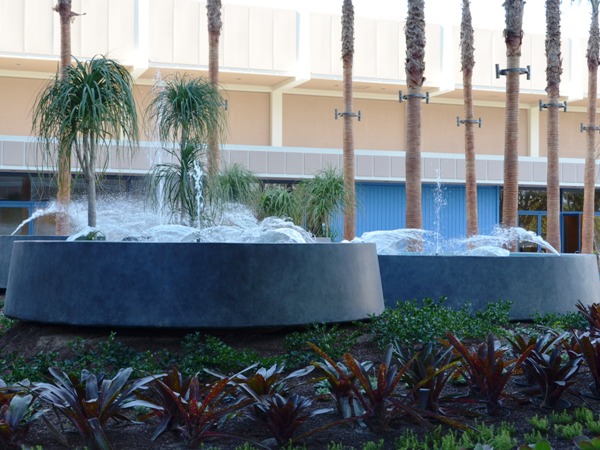 Image: Frontier meadow planter, formally the site for the Dancing Waters and Fantasy Waters shows. The fountain pool has been covered and planted. The operator console sat to the far left near the door to the fountain equipment room. The backdrop wall was the old fiber optic color display. The lawn area was a sunken amphitheater for audience viewing. I’ve spent many a night watching these shows, so I’m pleased that this area was preserved.