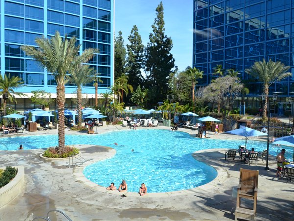 Image: New E-Ticket pool (from the pedestrian bridge). The Fantasy Tower is to the left and the Adventure Tower is to the right.